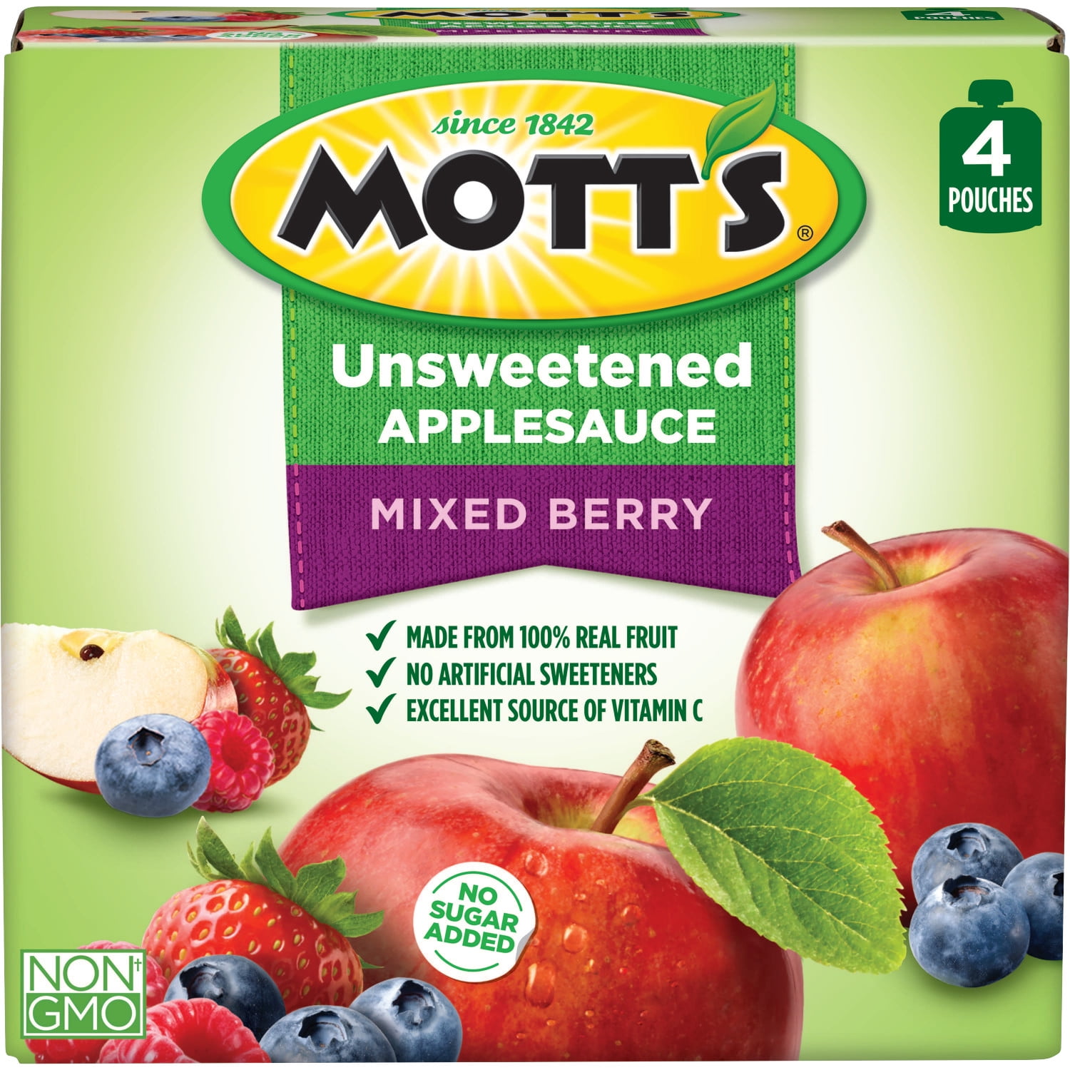 Not a low calorie food. Blueberry flavored applesauce with other natural flavors. 2,000 calories a day is used for general nutrition . Excellent source of vitamin c. Personalized health review for mott's unsweetened applesauce, blueberry: * the % daily value (dv) tells you how much a nutrient in a serving of food contribute to a daily diet. The original, delicious treat, mott's no sugar added mixed berry applesauce is the perfect snack or meal companion. No artificial flavors, colors or sweeteners. *the % daily value (dv) tells you how much a nutrient in a serving of food contributes to a daily diet. 2,000 calories a day is used for general nutrition . For unsweetened applesauce, this is really sweet. 40 calories, nutrition grade (b plus), problematic ingredients, and more. Prices may varymott's unsweetened mixed berry applesauce pouches.